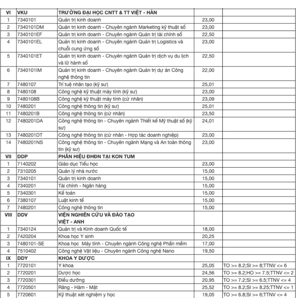 Trường xét tuyển theo bốn phương thức, gồm: xét theo điểm thi THPT, xét theo học bạ THPT, xét tuyển sinh riêng và xét theo điểm thi đánh giá năng lực của Đại học Quốc gia TP HCM, Đại học Bách khoa Hà Nội hoặc Kỳ thi đánh giá năng lực của khối các trường sư phạm. Năm ngoái, các trường, khoa của Đại học Đà Nẵng lấy điểm chuẩn theo kết quả thi tốt nghiệp THPT từ 15 đến 26,65.