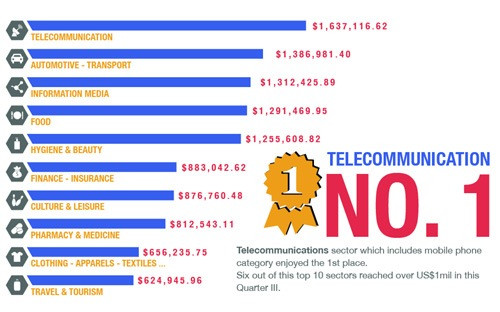 Trích báo cáo của iTracker.vn. 10 nhóm ngành chi nhiều nhất cho quảng cáo trực tuyến ở Việt Nam trong quý 3/2013 được báo cáo đưa ra bao gồm viễn thông (với mức chi hơn 1,6 triệu USD), ôtô - vận tải (gần 1,4 triệu USD), thông tin - truyền thông (hơn 1,3 triệu USD), thực phẩm (gần 1,3 triệu USD), hóa mỹ phẩm (gần 1,3 triệu USD), tài chính - bảo hiểm (hơn 863.000 USD), văn hóa - giải trí (gần 877.000 USD), dược phẩm (gần 813.000 USD), và du lịch - lữ hành (hơn 656.000 USD).