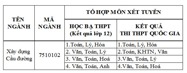 - Học bổng trị giá từ 500.000 - 2.000.000 VNĐ cho những thí sinh đăng ký vào học ngành Xây dựng Cầu đường có tổng điểm xét tuyển Học bạ THPT từ 22 điểm trở lên.