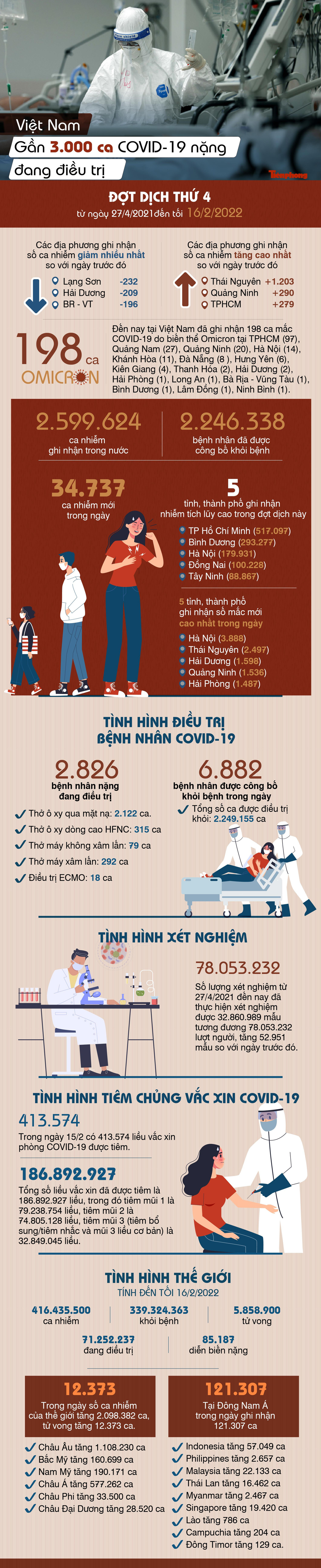 Trong ngày 16/2 có 2.738.773 liều vắc xin phòng COVID-19 được tiêm. Như vậy, tổng số liều vắc xin đã được tiêm là 189.761.776 liều, trong đó tiêm mũi 1 là 79.879.844 liều, tiêm mũi 2 là 75.740.234 liều, tiêm mũi 3 (tiêm bổ sung/tiêm nhắc và mũi 3 liều cơ bản) là 34.141.698 liều.