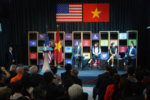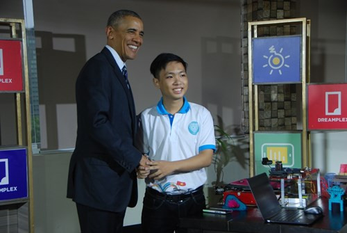 Ngay khi đến nơi, Tổng thống Mỹ Obama đã đến tầng 10 tham quan Khu văn phòng phức hợp Dreamplex, nơi trung bày các sản phẩm được sáng tạo bởi các nhà doanh nghiệp trẻ Việt Nam. Ở đây, Tổng thống Mỹ Obama đã gặp và trò chuyện với Ngô Huỳnh Ngọc Khánh, sinh viên năm 2 trường Đại học Khoa học Tự nhiên TPHCM, người sáng chế ra sản phẩm máy cắt lase. Khoảng 18h10 phút, buổi nói chuyện kết thúc. Ông Obama đã xuống tận nơi bắt tay thân mật các doanh nhân trẻ có mặt ở Dreamplex trước khi về khách sạn. Ảnh: Xuân Ba.