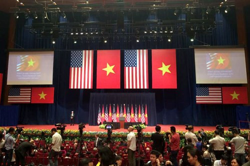 Trong bài phát biểu của mình, ông Obama nói ông trân trọng quá khứ lịch sử rất huy hoàng của Việt Nam qua hàng ngàn năm, với Trống đồng Đông Sơn, với Thủ đô nghìn năm tuổi. Thế giới biết đến lụa và nhiều bức tranh của Việt Nam. Văn Miếu là bằng chứng về trí tuệ của người Việt. Qua nhiều thế kỷ, Việt Nam bị nhiều nước can thiệp, nhưng tinh thần người Việt luôn bất khuất, để khẳng định điều Lý Thường Kiệt viết: “Sông núi nước Nam vua Nam ở/Rành rành định phận tại sách trời”.Ảnh: Reuters