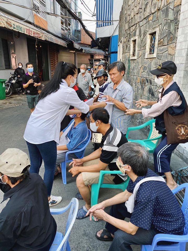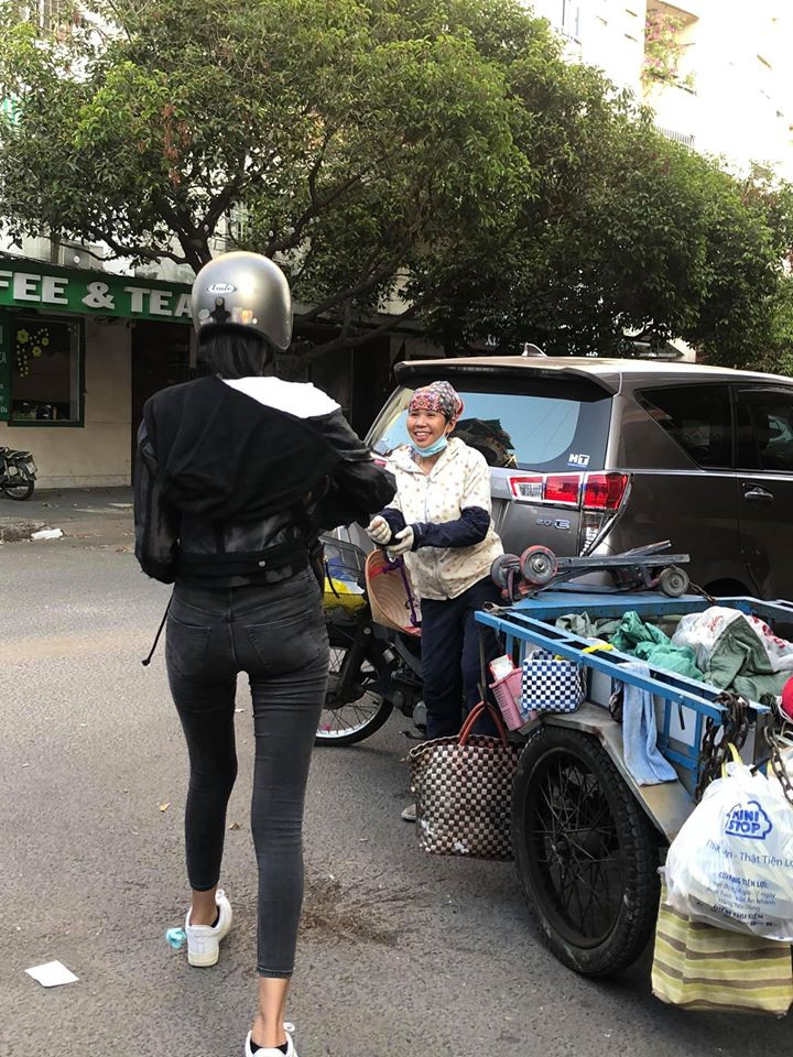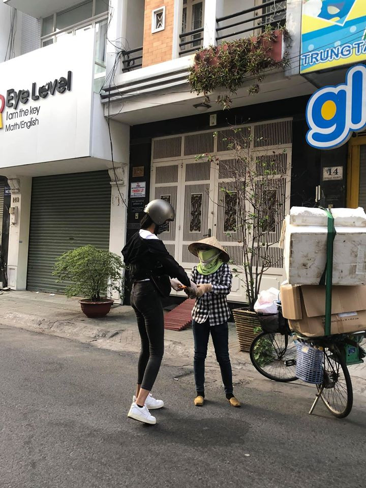 Á hậu Hoàng Thuỳ đi khắp Sài Gòn để phát khẩu trang cho những người nghèo.