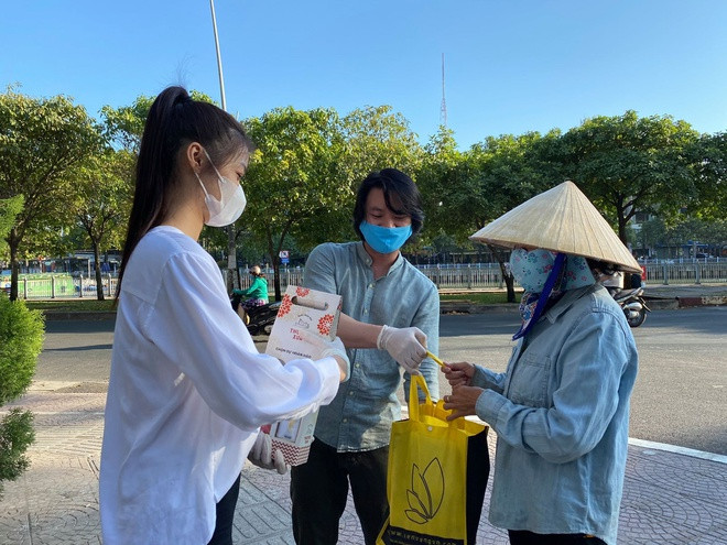 Á hậu Kiều Loan cùng đạo diễn Hoàng Nhật Nam cũng rong ruổi các con đường ở Sài Gòn để tặng quà cho những người dân gặp khó khăn trong mùa dịch.