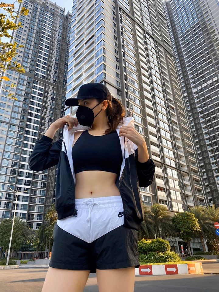 Hoa hậu Kỳ Duyên vẫn chăm chỉ tập thể dục trong mùa dịch.