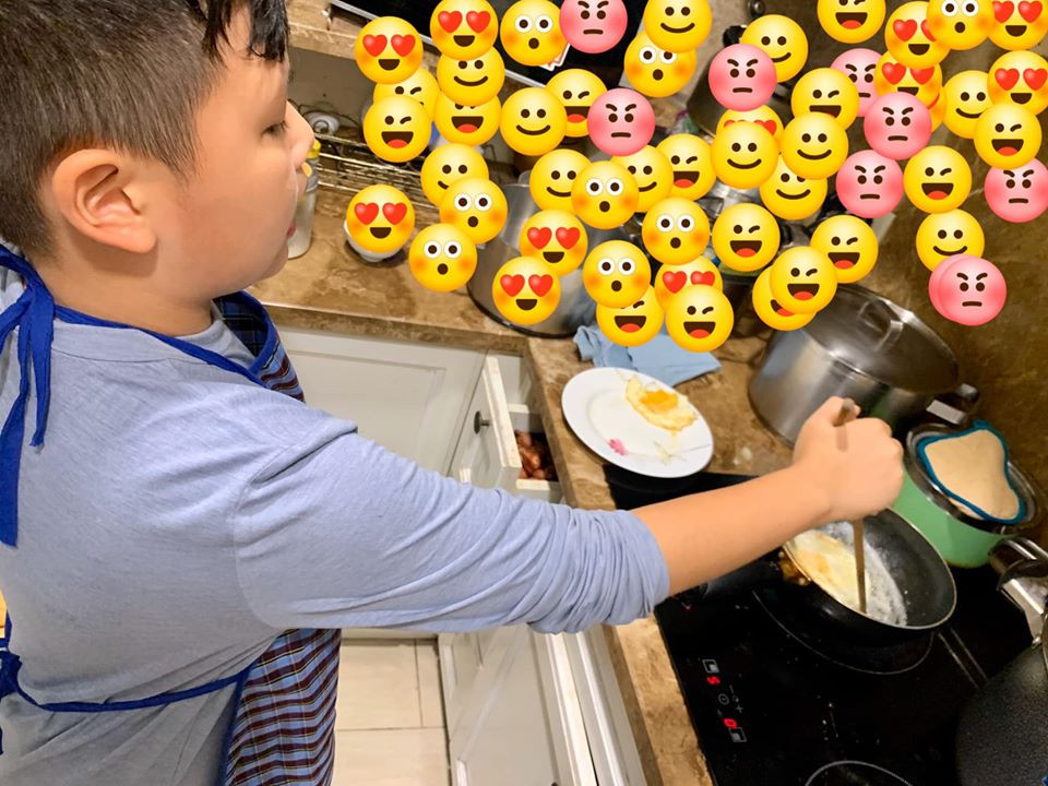 Á hậu Thuỵ Vân khoe ảnh con trai ở nhà chăm chỉ phụ giúp mẹ nấu ăn trong những ngày cách ly.