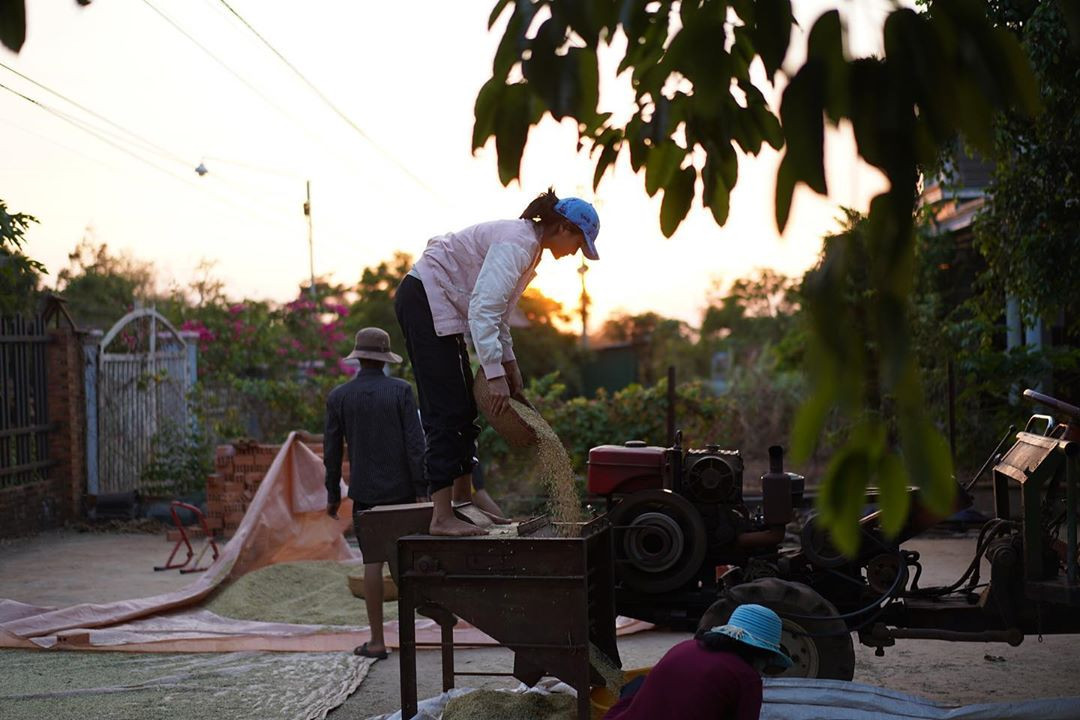 Hoa hậu H'Hen Niê khoe ảnh thu hoạch lúa cùng gia đình.