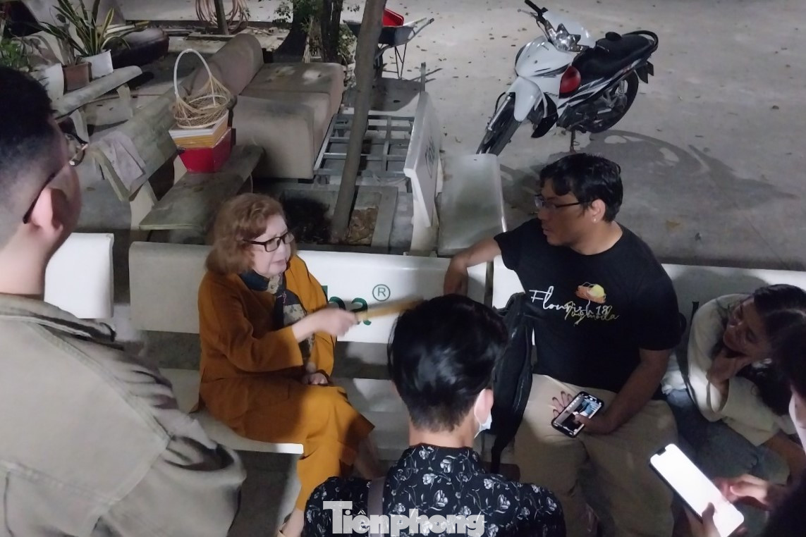 | NSƯT Kim Chi đang trò chuyện với con trai nghệ sĩ Thiên Kim tại đám tang |