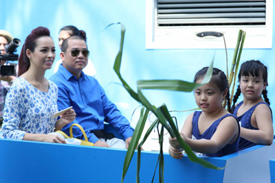 Gia đình Bình Minh - Anh Thơ xếp hàng dẫn hai con gái vào thăm mô hình chai sữa
