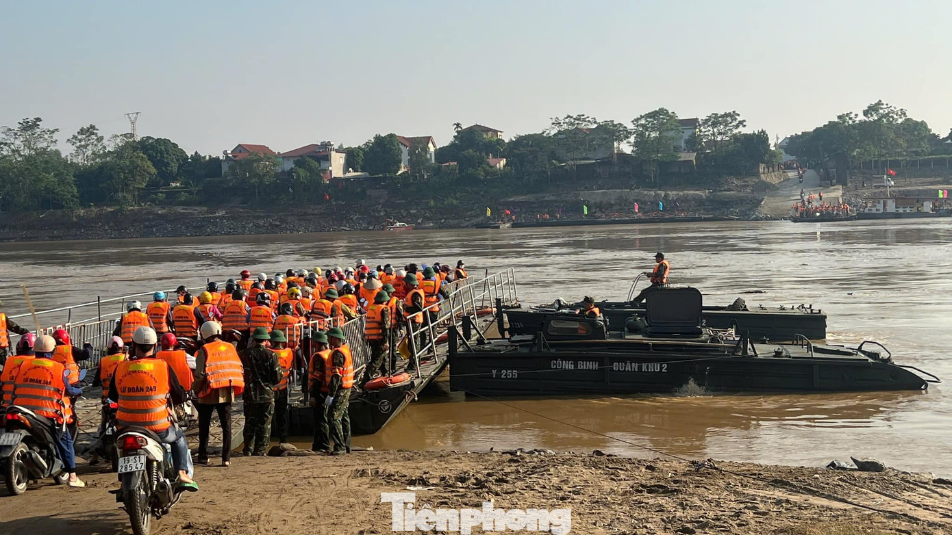 | Bên cạnh việc giúp dân khắc phục đường sá, những chiến sĩ Công binh Lữ đoàn 249 vẫn ngày đêm sử dụng phà quân sự đưa người dân qua sông đoạn ở cầu Phong Châu (Phú Thọ) bị sập. |