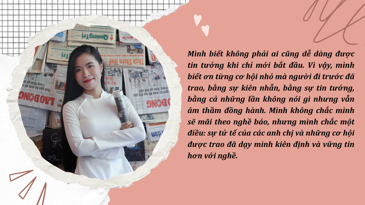 Trong suốt hành trình 5 năm “học nghề báo”, điều mà mình trân quý nhất không phải là số lượng bài viết được đăng hay những lời khen ngợi mà chính là những cơ hội dù nhỏ bé hay lặng thầm mà mình đã may mắn được đón nhận từ anh chị phóng viên, nhà báo và tòa soạn. Đó là cơ hội đầu tiên gửi những bản thảo còn non nớt đến anh chị, được các phóng viên, nhà báo mở lòng đón nhận một sinh viên chưa có gì trong tay ngoài niềm đam mê và những dòng chữ còn vụng về. Họ là những người đã sửa bài, âm thầm gửi lại những dòng động viên mình nỗ lực gắn bó với nghề. Đó là cả những lần bài không được đăng tải nhưng mình lại học được cách không bỏ cuộc.