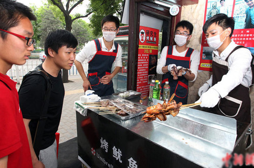 Ba nghiên cứu sinh ở thành phố Tây An hợp tác mở hàng mực nướng lưu động trên phố bán kiếm tiền. Ba người còn đặt tên "Mực nướng nghiên cứu sinh" để thu hút nhiều khách hơn.