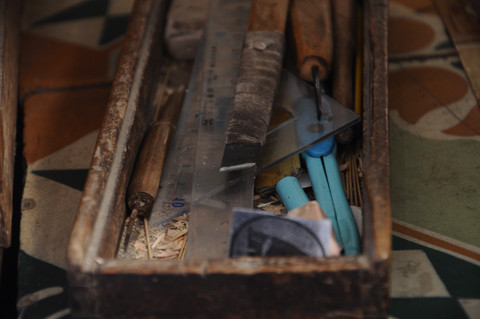 Đồ nghề để khắc gỗ đơn giản là những chiếc thước đo và dùi được mài sắc.
