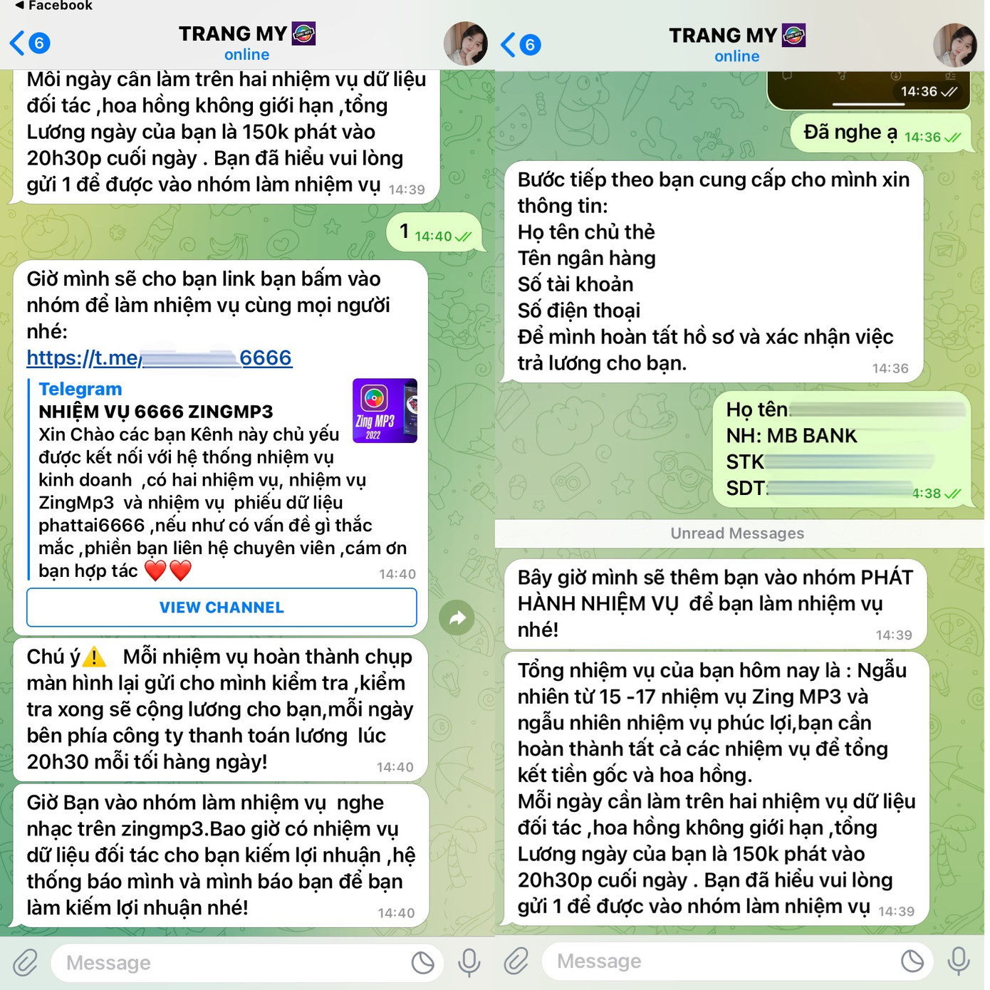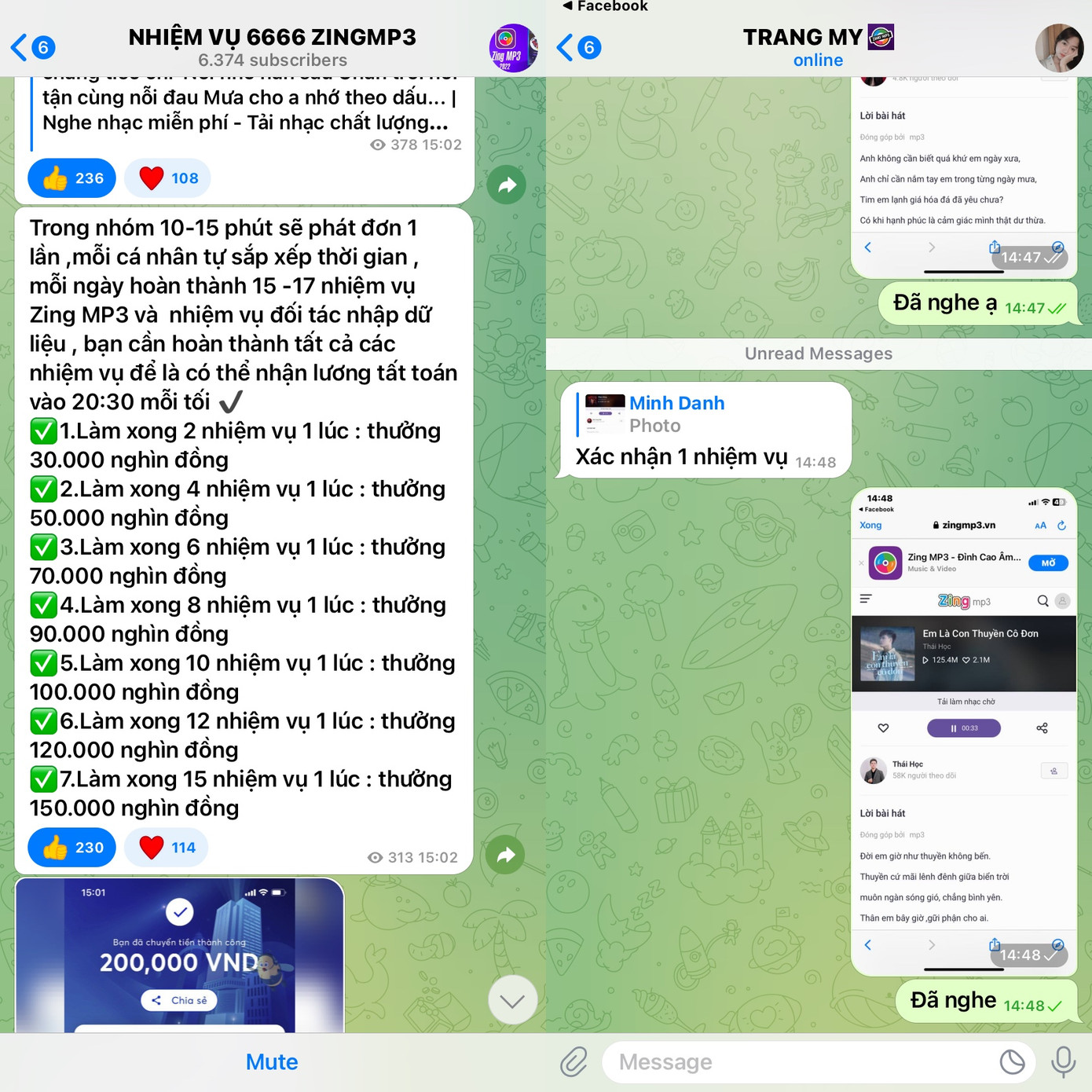 Nhiệm vụ bắt đầu được giao, người tham gia sẽ được thêm vào một group có tên “Nhiệm vụ 6666 ZingMP3”. Tất nhiên trong nhóm này, bạn chỉ có thể xem chứ không thể nhắn tin hay tương tác với những người khác, điều này để đề phòng những người bị lừa sẽ thông báo cho những người còn lại. Tại đây, các “con mồi” sẽ nhận được các nhiệm vụ nghe nhạc. Cách 5 đến 7 phút, sẽ có một đường link nghe nhạc được đưa ra. Các đối tượng yêu cầu nghe tối thiểu 30 giây, sau đó sẽ chụp ảnh màn hình và gửi cho “chuyên viên” mà bạn nhắn tin lúc đầu.