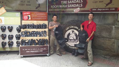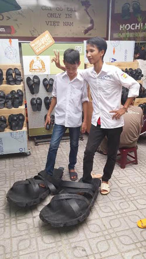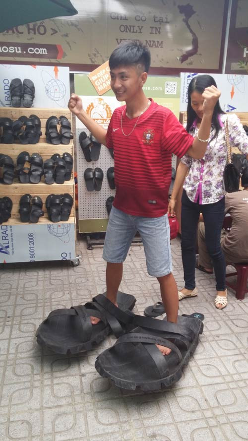 Còn chị Ngô Thị Sáu (Sóc Sơn, Hà Nội) thì xuýt xoa: “Đây là lần đầu tiên tôi được đeo đôi dép cao su to như thế này và tôi thực sự bất ngờ khi biết nó được làm thủ công”.