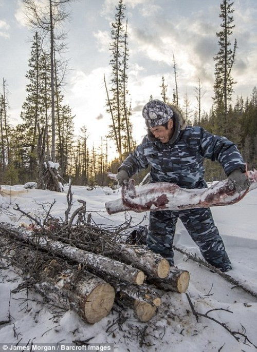 Trong ảnh là thợ săn Ion Maxsimovic bên một con chó sói đã bị bắn chết. Vào mùa đông, một người lớn có thể bị chết cóng trong 2 giờ đồng hồ tại Cộng hòa Sakha.