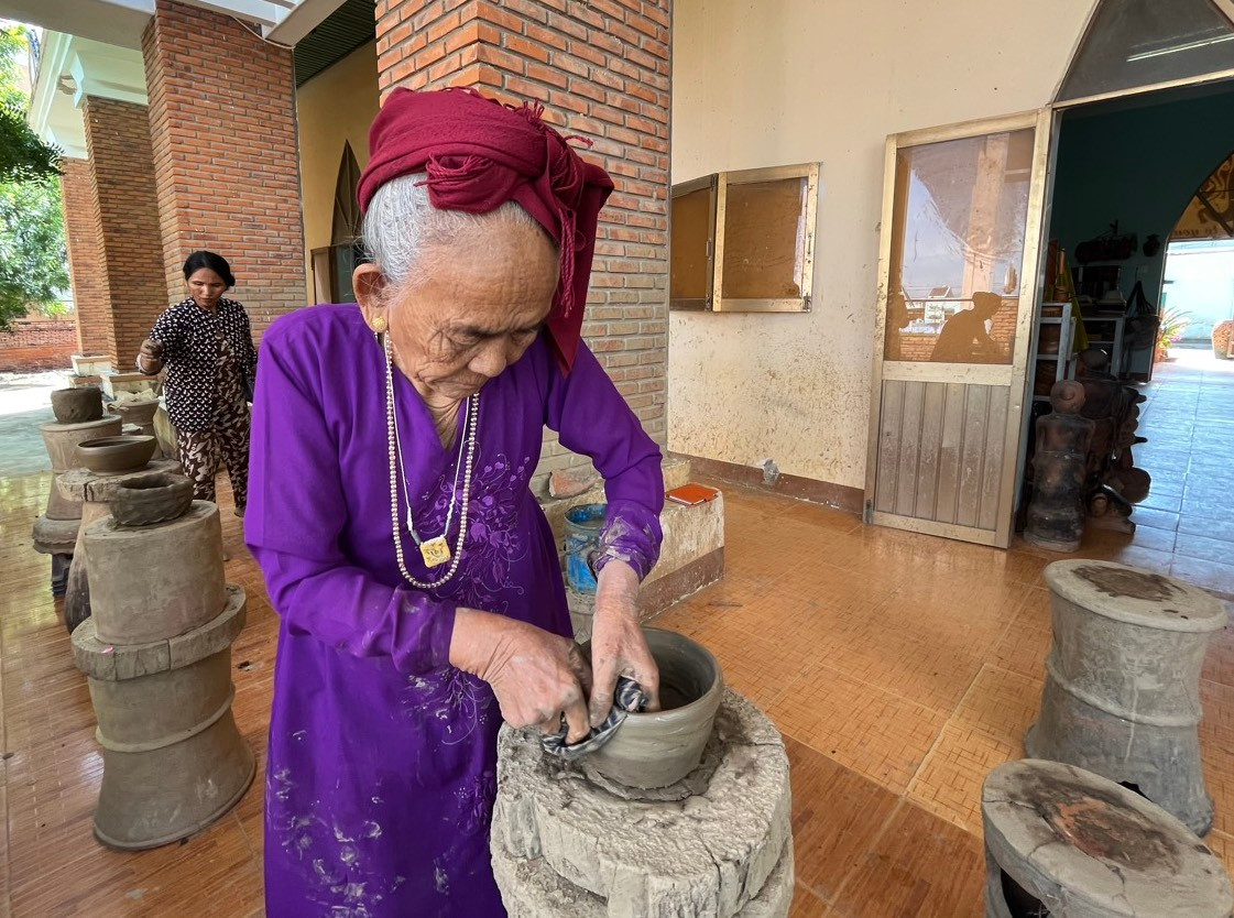 | Người Chăm làm gốm với kỹ thuật và quy trình thủ công truyền thống được các gia đình, nghệ nhân duy trì qua nhiều đời theo chế độ mẫu hệ “mẹ truyền - con nối”. |