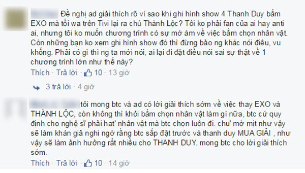 "Tôi mong ban tổ chức có lời giải thích sớm về việc thay nhóm EXO bằng nghệ sĩ Thành Lộc trong tiết mục của Thanh Duy. Còn không thì khỏi bấm chọn nhân vật làm gì nữa. Ban tổ chức cứ quy định cho nghệ sĩ phải hóa thân vào nhân vật ban tổ chức chọn luôn đi. Chứ mù mịt như vậy sẽ làm khán giả nghi ngờ rằng ban tổ chức sắp đặt trước và Thanh Duy mua giải", một khán giả tỏ thái độ bức xúc.