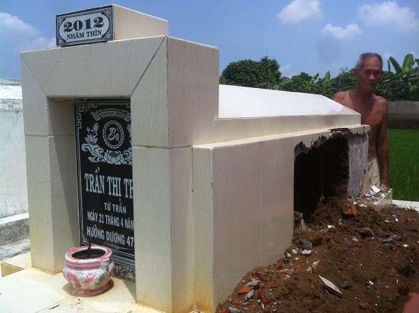 Đến nước này thì mọi người mới tá hoả, chạy ra nghĩa địa kiểm tra phần mộ của bà Trần Thị Thơm (vợ ông Khoẻ) thì phát hiện phần mộ này đã bị đã bị đục khoét rổng đến bên trong.