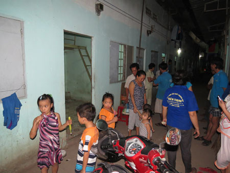 Căn phòng trọ chị Bé bị chồng mình bóp cổ đến chết và nhiều người dân đang nghe ngóng thông tin.