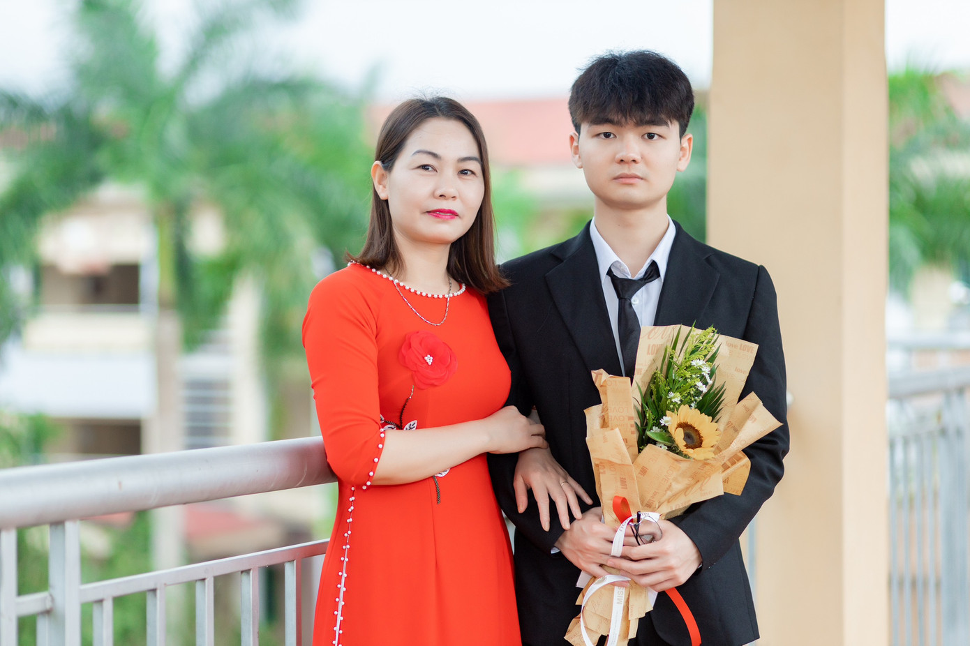 | Thái Hòa chụp ảnh cùng gia đình trong buổi lễ khai giảng năm học 2023 - 2024 tại Trường Đại học Xây dựng Hà Nội. |