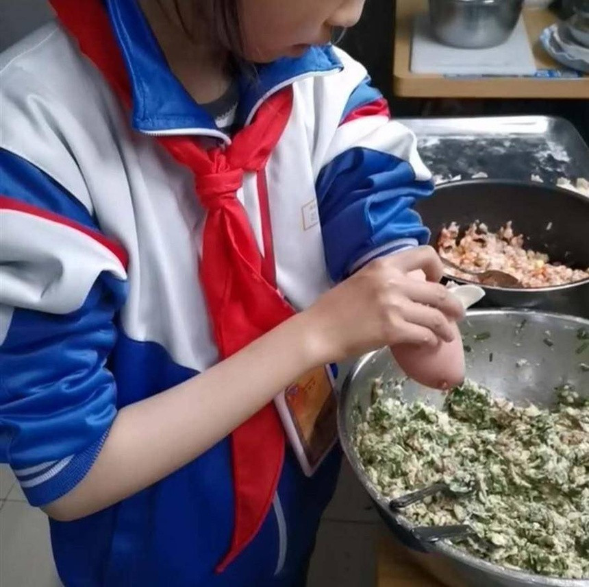 Trong clip, với những ngón tay khéo léo nhanh nhẹn, Qingqing giữ vỏ bánh trên cánh tay trái bị khuyết, tay phải của em xúc nhân bỏ vào vỏ bánh,