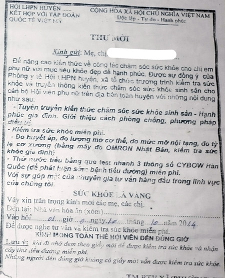 Chị H. bức xúc: “Vì trước đó, cán bộ địa phương đưa chúngtôi thư mời với nội dung khá hấp dẫn. Tin lời cán bộ địa phương và cũng muốnđược biết về cách phòng, điều trị bệnh nên người dân chúng tôi đã tranh thủthời gian tham gia đầy đủ. Tuy nhiên, đến thời điểm này chúng tôi mới ngã ngửavì tiền đã mất nhưng tật vẫn phải mang”.