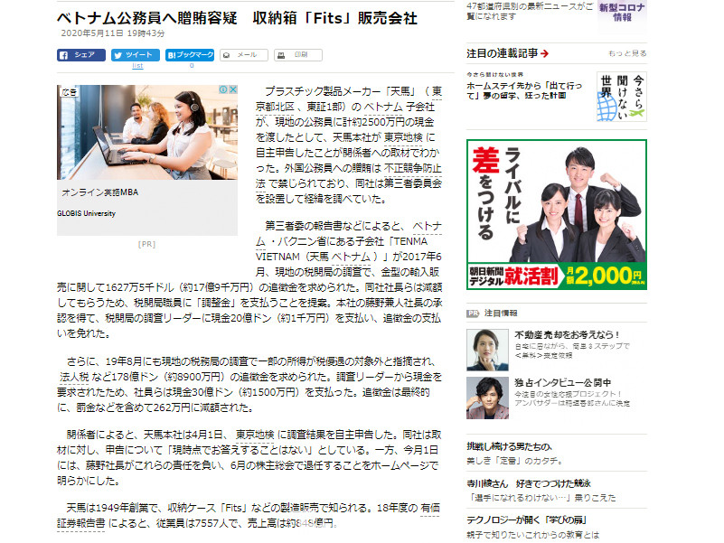 Theo Đại sứ quán Việt Nam tại Nhật Bản, bài báo trên Asahi thông tin, khoản tiền trên được lãnh đạo Cty Tenma cho phép chi trả, thực hiện qua 2 lần nhằm mục đích để cơ quan thuế Việt Nam miễn giảm khoản truy thu thuế đối với công ty con tại Việt Nam.