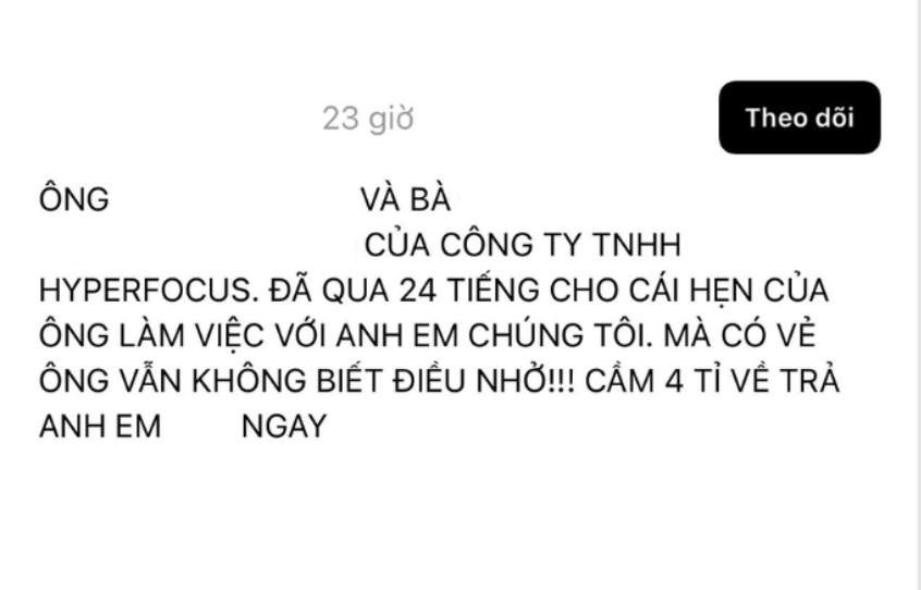Mới đây, người bạn của hai nam rapper tiếp tục cập nhật tình hình trên Threads. Người này cho biết đã hơn 24 giờ trôi qua kể từ khi hai bên thống nhất gặp mặt để giải quyết vấn đề, phía quản lý HYPERFOCUS vẫn không đưa ra bất kỳ phản hồi nào.