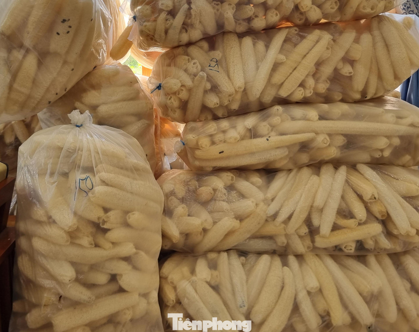 | Công nhân bóc vỏ mướp lấy xơ. |