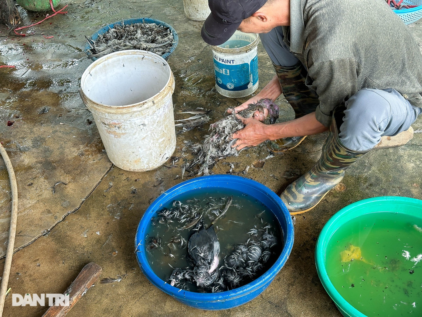 Khi vặt lông xong, nước bẩn được chủ quầy xả ngay tại chỗ và tràn từ vỉa hè xuống lòng đường. Nếu khách yêu cầu thui chim, họ tiếp tục lấy rơm, châm lửa và thui nhanh thoăn thoắt.