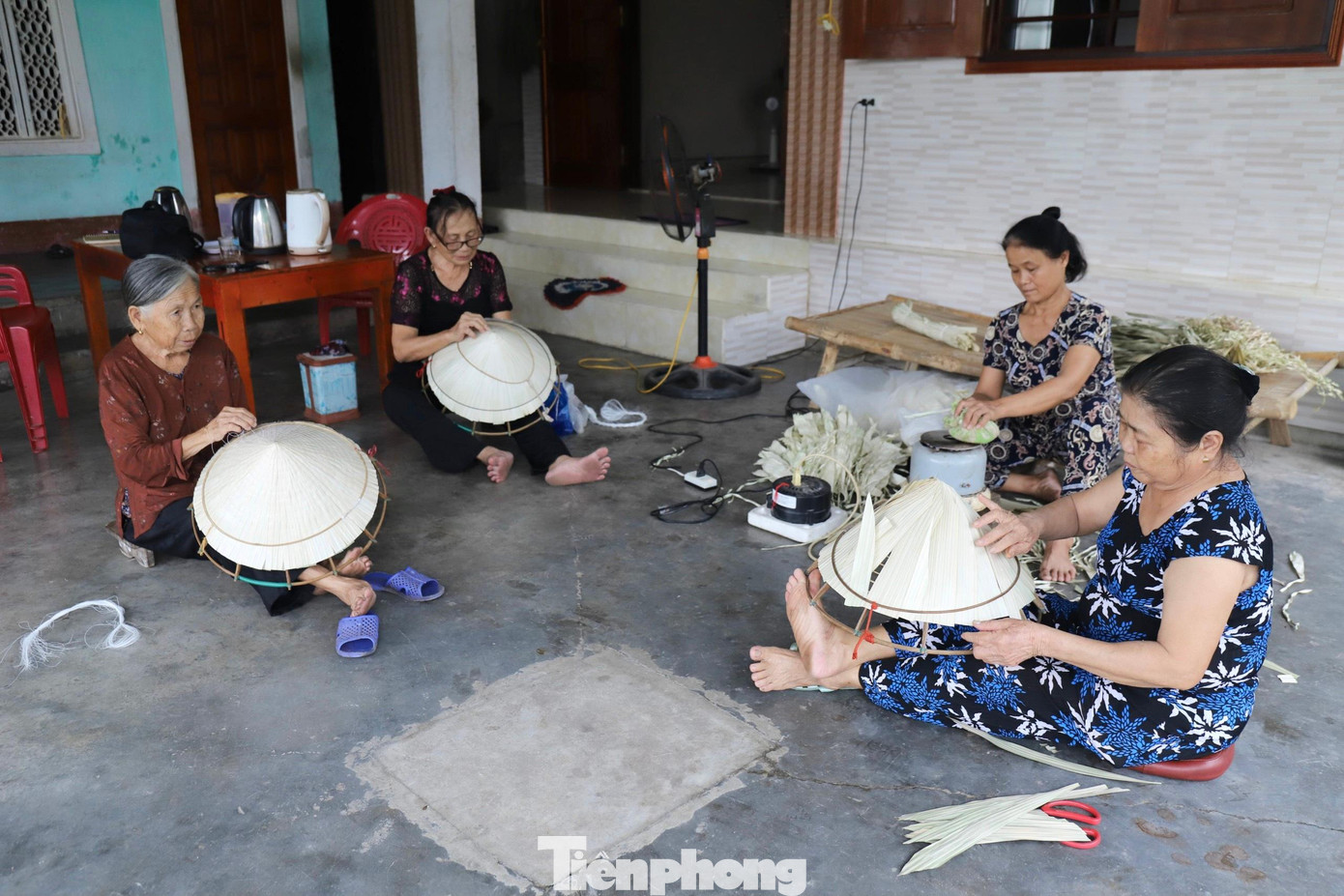 Lá nón sau khi phơi khô sẽ ủi cho thật phẳng, còn tre được vót tròn rồi uốn thành từng vành theo khuôn. Để cố định từng lá nón, người dân sử dụng cước để khâu.