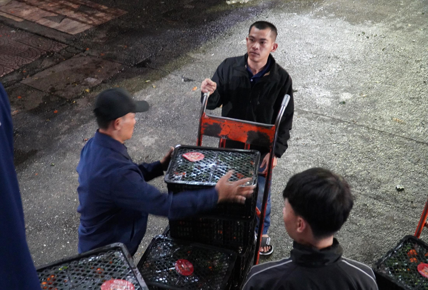 Gần 20h, những chiếc container nối nhau vào chợ đầu mối. Khoảng sân trước chợ dội lên âm thanh hỗn độn từ động cơ xe gầm gào, tiếng hô gọi nhau, tiếng lạch cạch từ những xe đẩy nối đuôi đi tới. Xe đỗ xịch lại, mấy thanh niên nhanh nhẹn ra mở cửa rồi nhảy vọt lên thùng.