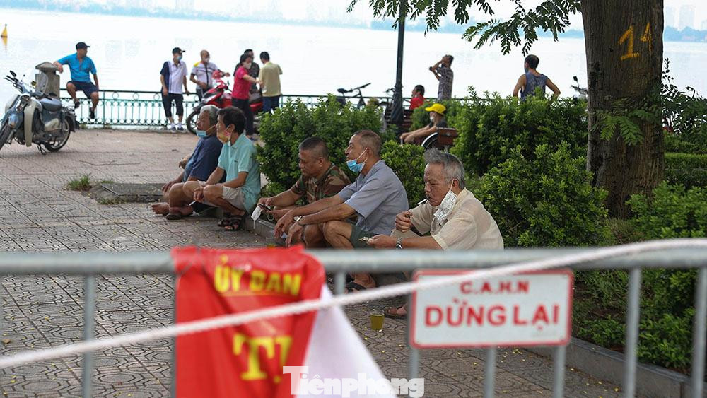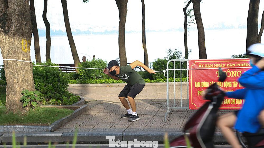 Lực lượng chức năng đã dựng hàng rào, lắp biển cấm tụ tập đông người, tạm dừng hoạt động thể dục, thể thao nhưng người dân vẫn thản nhiên "vượt rào".