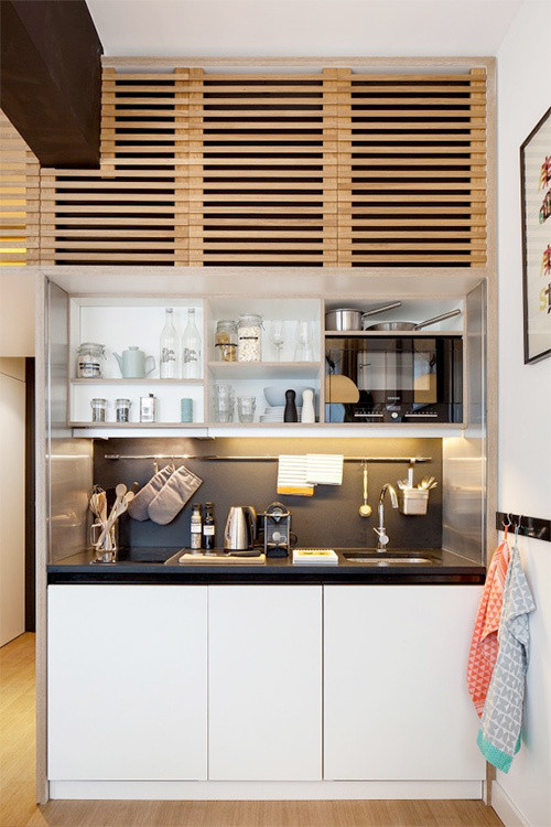 Ý tưởng của các kiến trúc sư là tích hợp nội thất thông minh trong một không gian nhỏ. Cầu thang dẫn lên gác xép có thể xếp gọn vào tủ, bàn làm việc dưới giường...