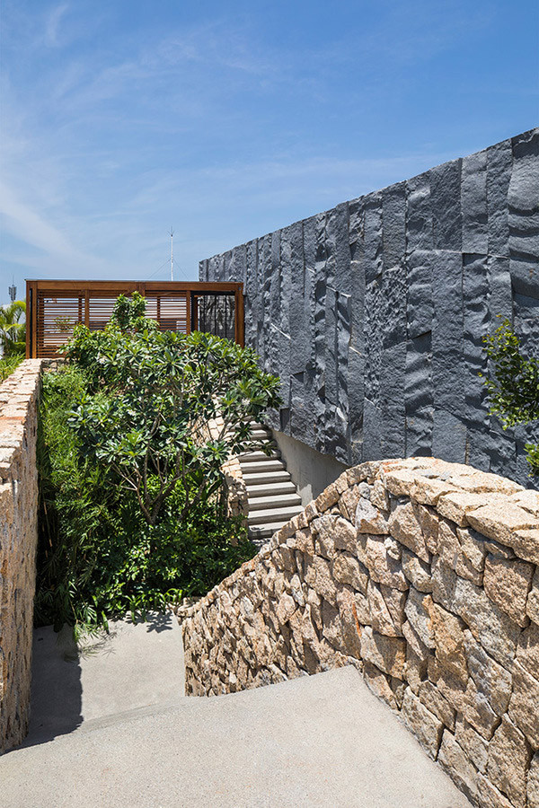 Mặt tiền nhà là bức tường bằng đá được chạm khắc thô sơ, như một sự nối tiếp với không gian đồi núi xung quanh. Bức tường đá đảm bảo được sự riêng tư của công trình nhưng hoàn toàn không ngăn cản tầm nhìn từ ngôi nhà hướng ra biển.