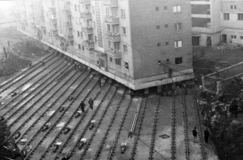 Tòa nhà nặng 7.600 tấn chắn ngang đường, trở thành vật cản khi các nhà chức trách muốn xây một đại lộ trong thành phố Alba Iulia, Romania, vào năm 1987. Đây là một trong những chung cư theo phong cách Liên Xô mọc lên ồ ạt tại Romania giữa thế kỷ 20.
