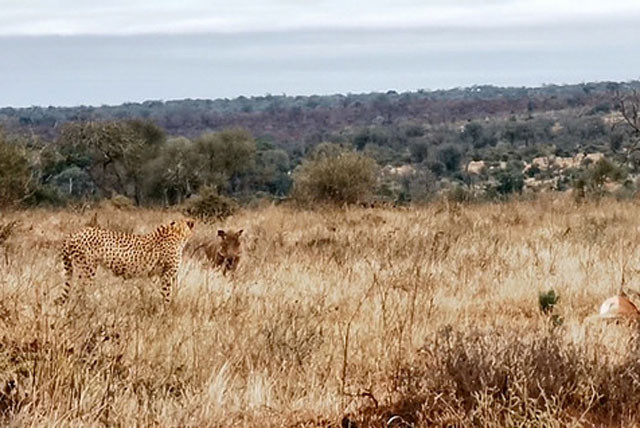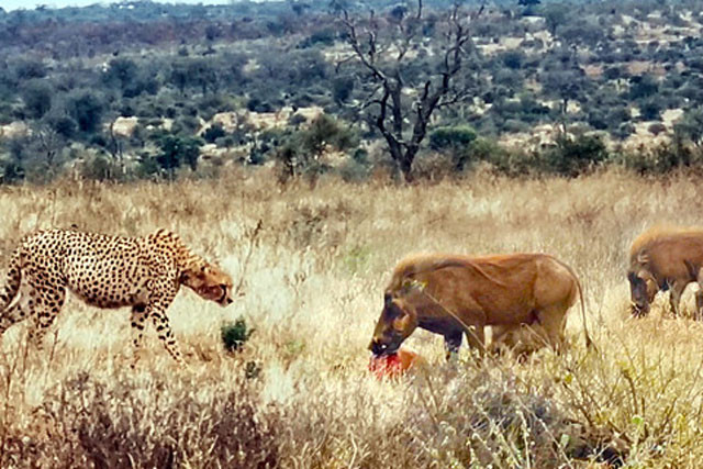 Thế nhưng, khi chưa kịp “nhập tiệc” con báo đã phải chạm trán với gia đình lợn bướu và dường như đối thủ muốn cướp bữa ăn của nó.