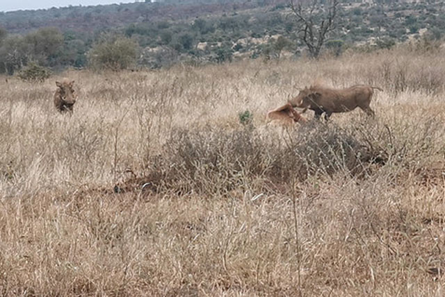 Đây là một cảnh tượng khá hiếm, bởi bầy lợn bướu không chỉ cướp mồi của kẻ ăn thịt đáng sợ, mà còn ngấu nghiến thịt linh dương.
