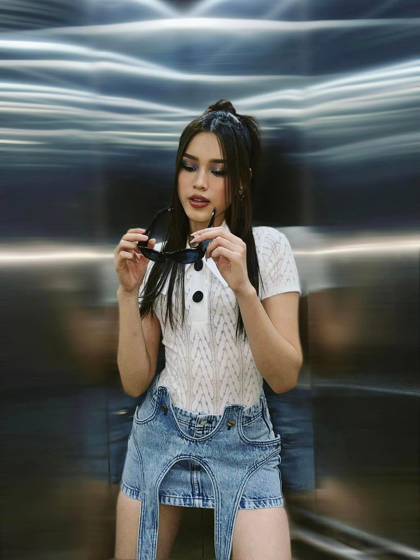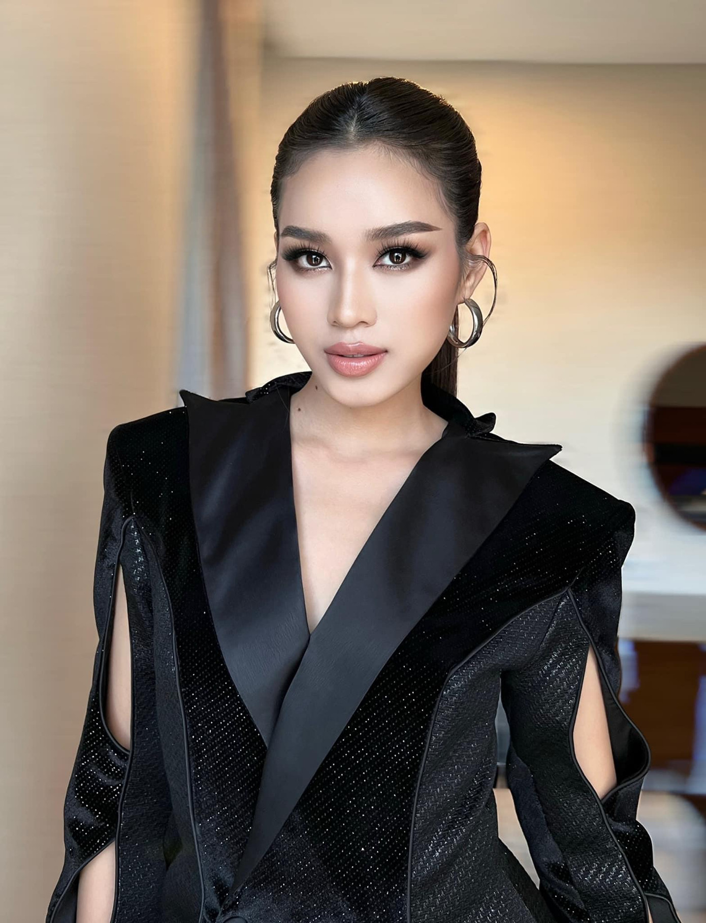 Đặc biệt nhất là nàng hậu thay đổi layout trang điểm với đôi mắt khói phủ nhũ xanh, đôi môi thoa son bóng mang lại diện mạo đầy mới mẻ. Kiểu tóc đầy trẻ trung càng khiến Đỗ Thị Hà đậm phong cách trẻ trung và có chút nổi loạn.