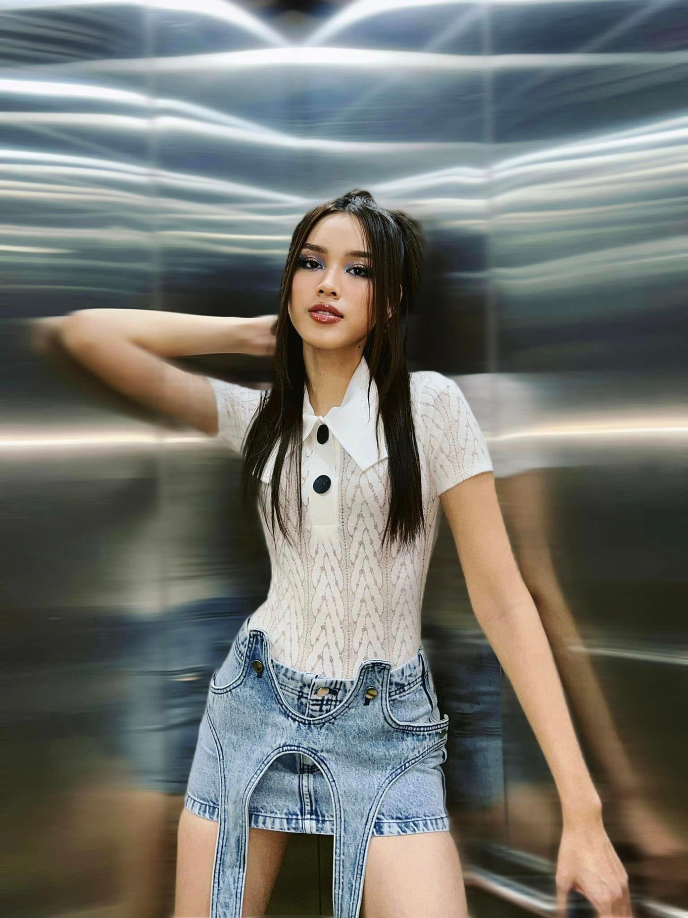 Nhưng mới đây, nàng hậu đã "lột xác" trong một sự kiện. Không phải ai cũng nhận ra Đỗ Thị Hà trong set đồ cá tính gồm áo thun polo, chân váy jeans có thiết kế rất độc đáo, mang đậm hơi thở trào lưu Y2K đang cực hot này.