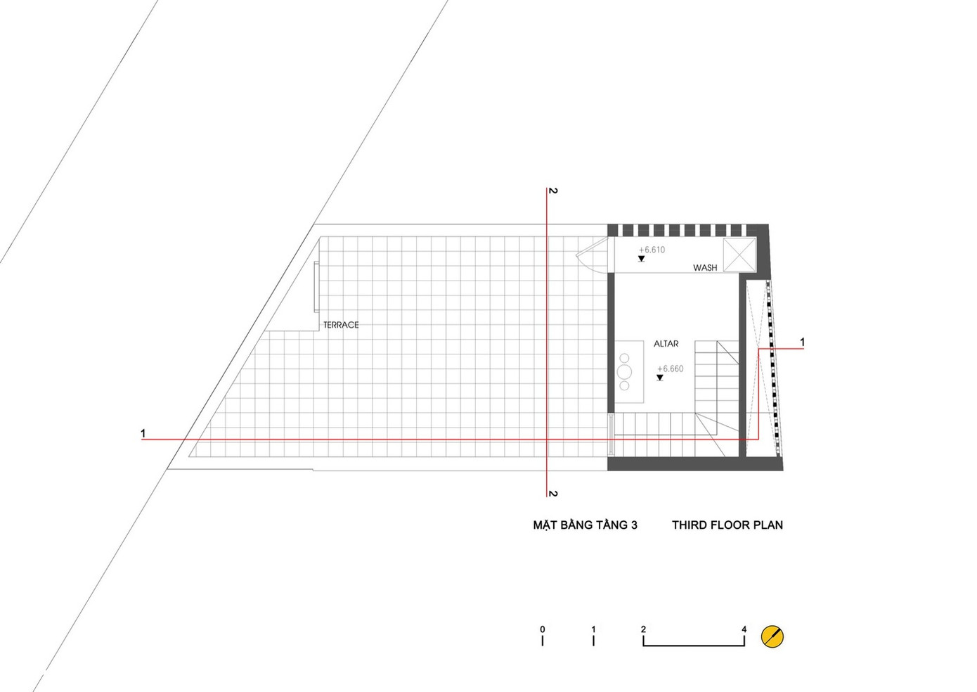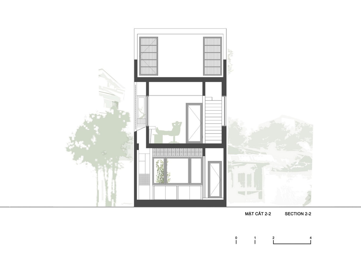 | Khoảng trống ở góc thon nhất phía trước khu đất, được sử dụng để trồng cây xanh tạo sự riêng tư cho không gian bên trong, ngăn cách với đường đi nhưng vẫn đảm bảo thông gió và ánh sáng tốt cho phòng khách và mặt tiền. |