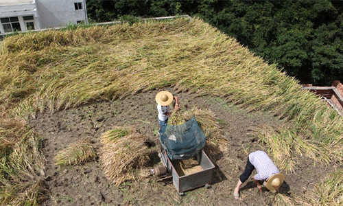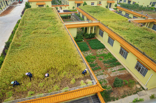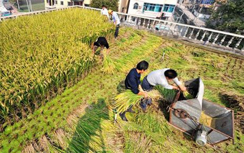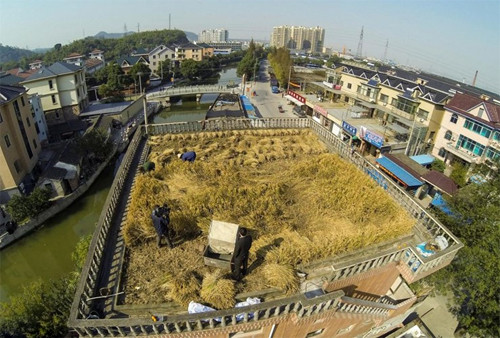 Ngày càng nhiều người dân châu Á lựa chọn hình thức canh tác trên mái nhà. Họ còn vận chuyển cả thiết bị tuốt lúa lên trên mái.