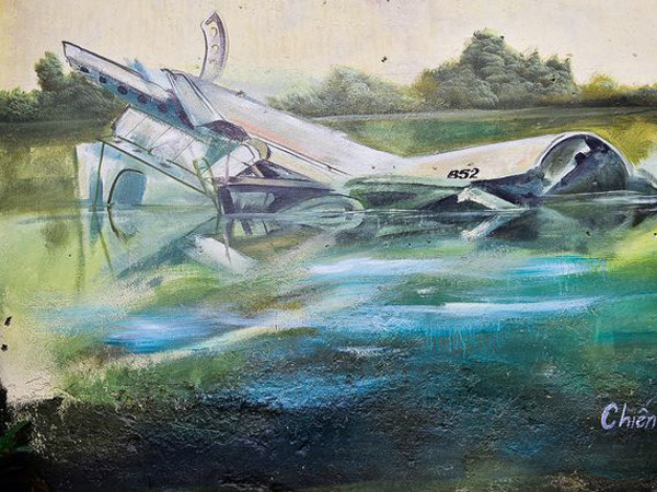 Đặc sắc nhất trong hơn 30 bức bích họa là hình xác ''pháo đài bay'' B52 nằm giữa lòng hồ làng hoa Ngọc Hà, một trong những di tích lịch sử được giới thiệu tới khách tham quan.