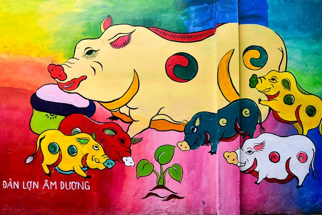 Bức bích họa đàn lợn âm dương, những xoáy âm dương trên mình heo mẹ và heo con là thể hiện của sự vận động không ngừng và chuyển hóa qua lại giữa Âm và Dương.