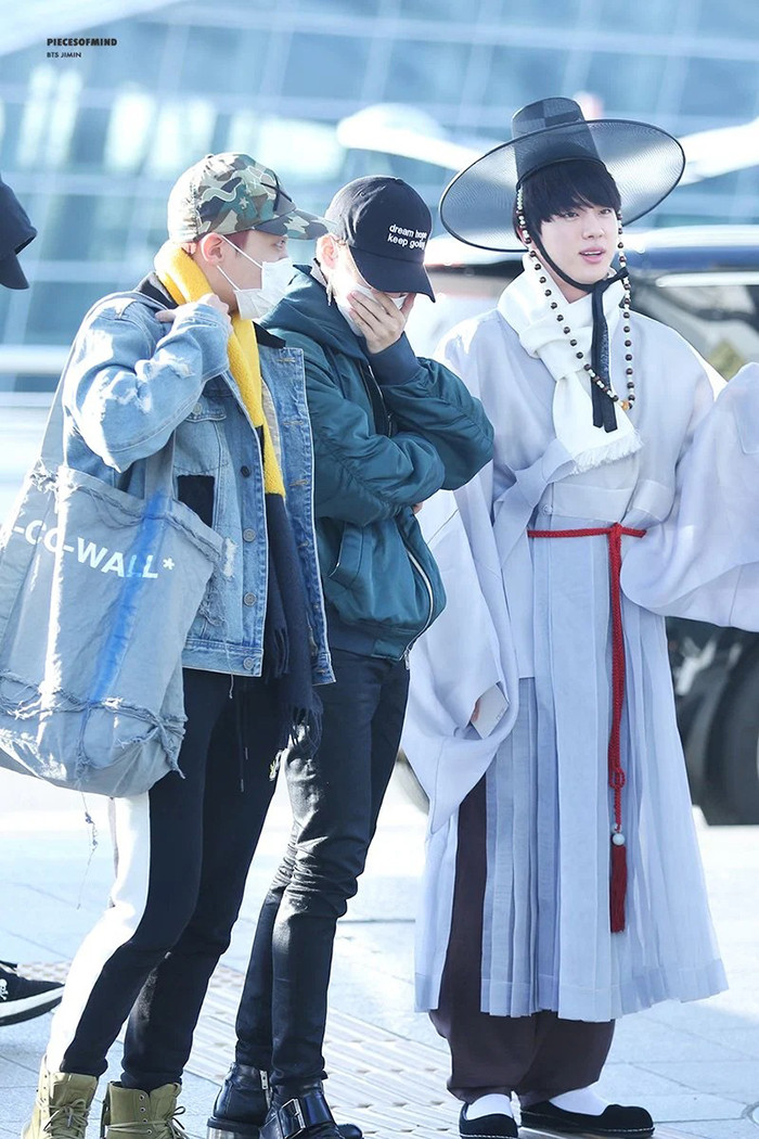 Một lần do thua game, Jin phải mặc bộ đồ hanbok này ra sân bay, nhưng nhìn tâm trạng vui vẻ và tự tin của Jin, nhiều fan tin rằng khéo Jin cố tình thua để được mặc bộ trang phục này luôn ấy chứ! Nhìn xem, các thành viên đi cạnh ai cũng đeo khẩu trang, còn Jin thì đã không đeo khẩu trang rồi, mà còn chẳng ngại ngần gì, cứ tươi như hoa.