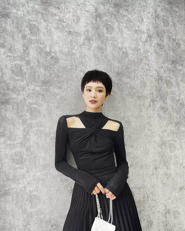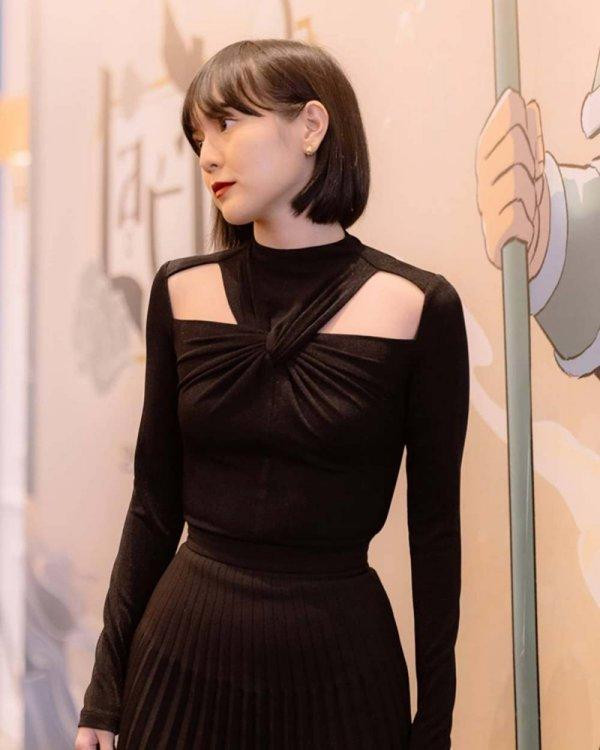 Còn nhớ trong lần đầu tiên Hải Tú xuất hiện trước công chúng với tư cách nghệ sĩ độc quyền trực thuộc công ty giải trí của Sơn Tùng M-TP, cô chọn một bộ váy đen khá kín đáo và nền nã tôn lên làn da trắng mịn.