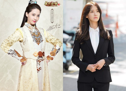Không chỉ thành công với tư cách thành viên của nhóm SNSD, vài năm trở lại đây, Yoona gây chú ý khi liên tục đóng phim. Tạo hình và khí chất nhân vật của cô trong series "Võ thần Triệu Tử Long" (trái), "K2" (phải) được khen ngợi. Diễn xuất của nghệ sĩ nhà SM ngày càng được cải thiện.
