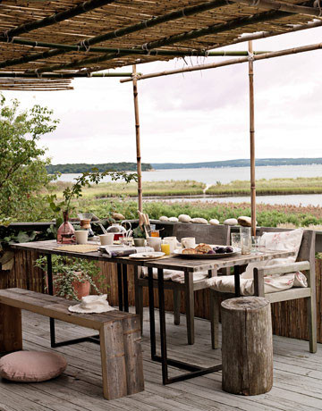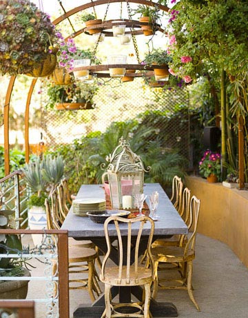 Để có được bữa tối ngoài trời ấm cúng, không nhất thiết phải bố trí một không gian ngay sát hiên nhà. Với những thiết bị ngoại thất đồng bộ và thiết kế hợp lý bạn có thể tạo nên một góc phòng ăn ngoài trời ở bất kì đâu trong vườn nhà bạn. Những chiếc giá nến lung linh làm tăng độ huyền ảo cho không gian, trong khi những dãy đèn vườn tạo nên những lối đi đẹp mắt.