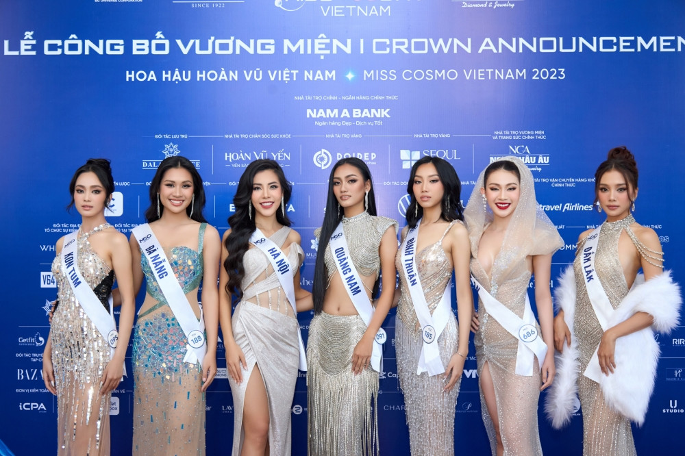| Dàn thí sinh Hoa hậu Hoàn vũ Việt Nam 2023 tại buổi họp báo. |